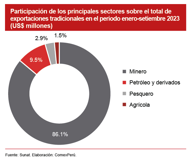Por su parte, las exportaciones no tradicionales, que representaron un 27.5% del total exportado a setiembre de 2023, sumaron US$ 12,878 millones. El sector agropecuario lideró el rubro, al representar un 44.9% del total exportado. Sin embargo, en el periodo analizado, las exportaciones de dicho sector, que alcanzaron los US$ 5,779 millones, cayeron un 0.1%. Le siguen los sectores químico (US$ 1,482 millones; -17%), pesquero (US$ 1,424 millones; +19%), textil (US$ 1,211 millones; -15.8%), siderometalúrgico (US$ 1,126 millones; -8.9%) y minería no metálica (US$ 916 millones; 26.6%).