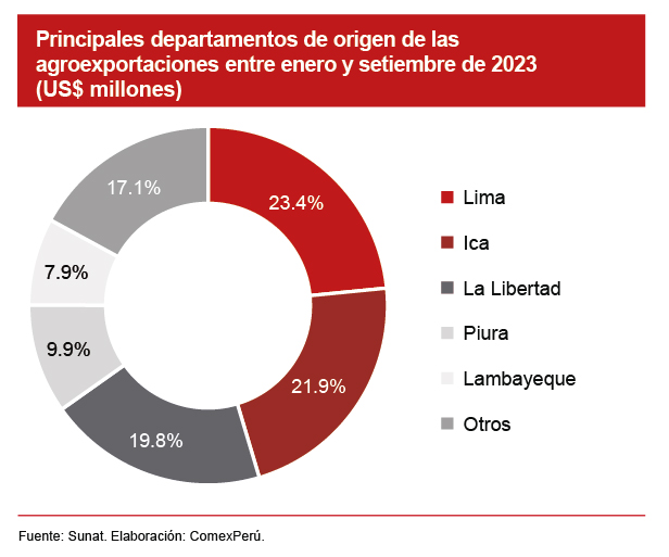 En lo que respecta a los principales departamentos de origen de las agroexportaciones, Lima encabezó la lista, con envíos por US$ 1,355 millones (+7.5%), seguido por Ica (US$ 1,268 millones, +4.9%), La Libertad (US$ 1,145 millones, -9.3%), Piura (US$ 571 millones, +3.2%) y Lambayeque (US$ 454 millones, -21.2%). En relación con la participación sobre el total de exportaciones del rubro, los departamentos del interior del país sumaron el 76.6%.