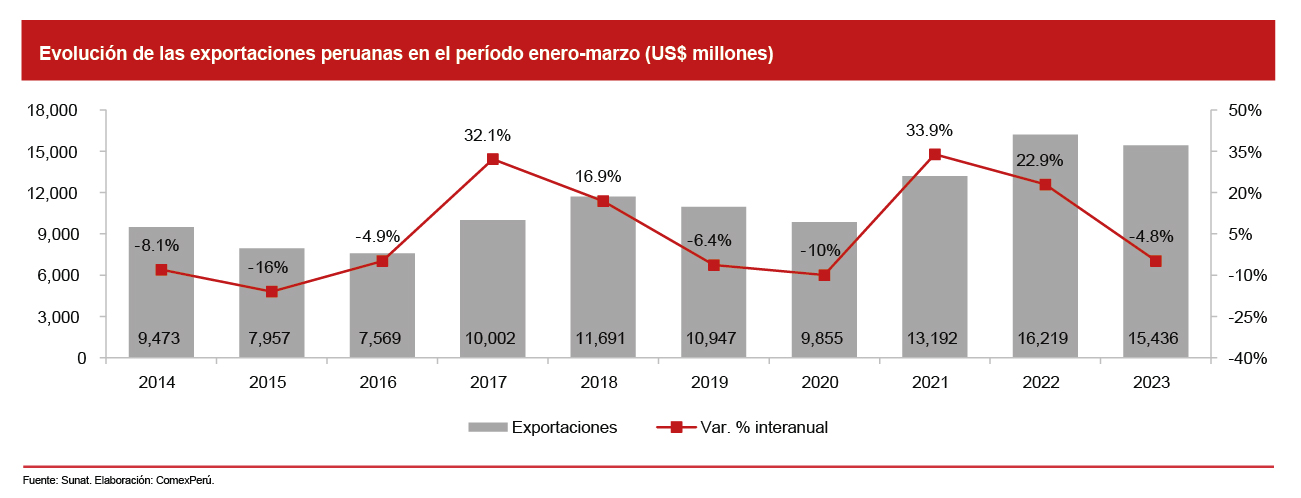 LAS EXPORTACIONES PERUANAS DISMINUYERON UN 4.8% EN EL PRIMER TRIMESTRE DE 2023