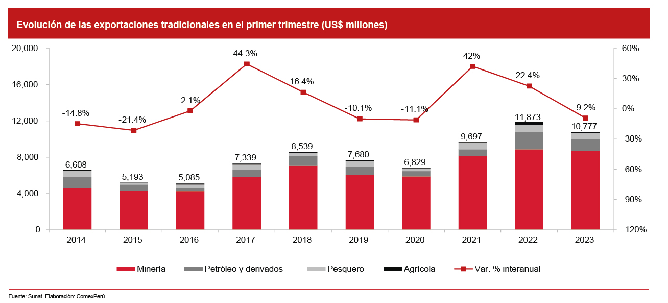 En lo que respecta a las exportaciones tradicionales, estas siguieron presentando una mayor concentración, al igual que en años anteriores. Su participación fue del 69.8% sobre los envíos totales durante el primer trimestre del año. Sin embargo, los envíos del rubro cayeron un 9.2%, al registrar un valor de US$ 10,777 millones, en comparación con los US$ 11,872 millones del mismo período del año anterior.