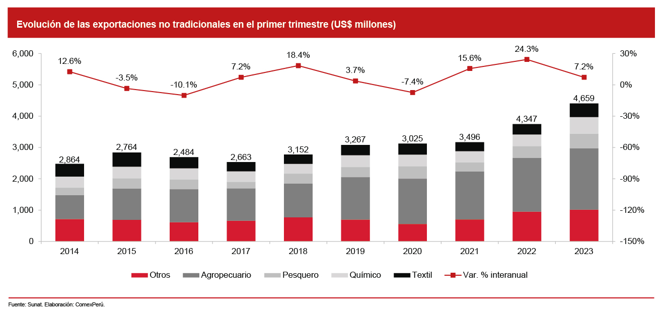 En cuanto a las exportaciones no tradicionales, estas siguen mostrando un buen desempeño, ya que se realizaron envíos por US$ 4,659 millones durante el primer trimestre del año, lo que significó un aumento del 7.2% respecto del mismo período de 2022. Los principales sectores del rubro fueron el agropecuario, con un total de US$ 2,157 millones y un incremento del 9.8%; el pesquero (US$ 599 millones, +29.2%); el químico (US$ 456 millones, -13.5%) y el textil (US$ 434 millones, -1%). El resto sumó US$ 1,013 millones (+6.4%).