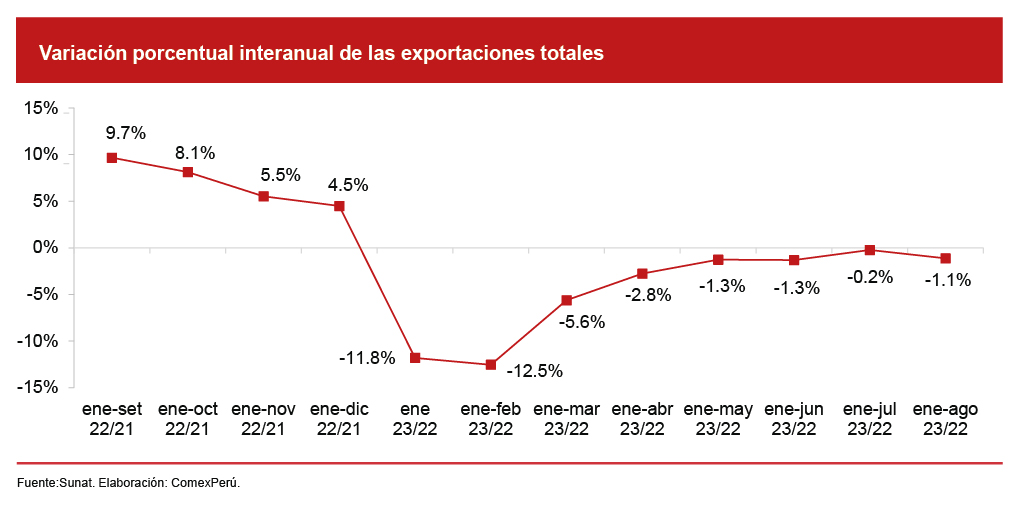 Este 2023 es un año desafiante para el sector exportador. Iniciar un año con protestas sociales y cierre de carreteras, para luego enfrentar las consecuencias de los fenómenos climáticos, ha hecho que el dinamismo de nuestras exportaciones no sea óptimo. Tanto es así que las tasas de crecimiento interanual de los ocho meses del año se mantuvieron en rojo. Según cifras de la Sunat, en el periodo enero-agosto de 2023, nuestras exportaciones totales sumaron US$ 41,164 millones, lo que reflejó una caída del 1.1% en comparación con el mismo periodo del año pasado.