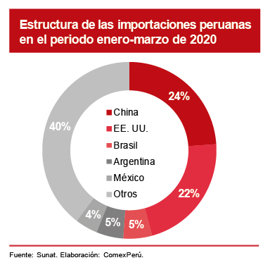 De acuerdo con cifras de la Sunat, en el primer trimestre del año, las importaciones peruanas sumaron un valor de US$ 9,748 millones, lo que reflejó una caída del 5.5% con respecto al mismo periodo de 2019. Entre los principales países de origen destaca China, del cual registramos compras por US$ 2,328 millones, un 11.6% menos que en el periodo enero-marzo de 2019 y que representaron un 23.9% del total importado. El segundo lugar del ranking de importación lo ocupó EE. UU., con US$ 2,134 millones, lo que significó un leve incremento del 1.2% y representó un 21.9% del total.