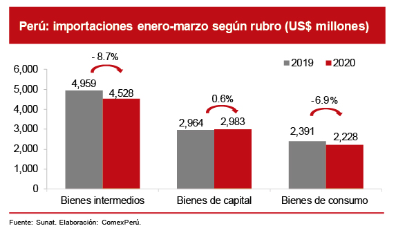 En lo que respecta a nuestras importaciones en el mes de marzo, estas sumaron un total de US$ 2,724 millones, lo que reflejó una fuerte caída del 19.1% con relación al mismo mes de 2019, la mayor reducción en los últimos diez años. En cuanto a los países de origen, EE. UU. fue el principal proveedor, con US$ 635 millones (-4.6%), seguido por China, con US$ 433 millones (-51.2%). Según el Banco Central de Reserva del Perú (BCRP), la reducción en el valor de las importaciones se debió, principalmente, a las menores compras de insumos (destinados a la industria y combustibles) y de bienes de capital (para la industria y equipos de transporte).
