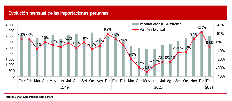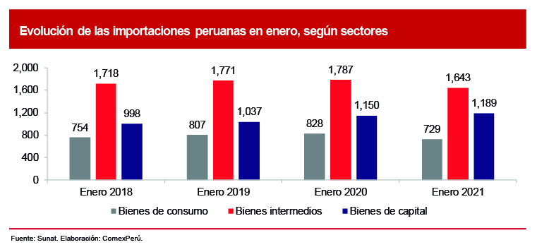 Durante enero de 2021, el intercambio comercial del Perú con el mundo muestra importantes señales de recuperación en comparación con lo experimentado en los meses anteriores. Según cifras de la Sunat, las exportaciones peruanas decrecieron un 4.5% frente a lo reportado en enero de 2020, y las importaciones retrocedieron un 5.6% en el mismo periodo. Si bien son cifras negativas, sin duda representan una aceleración en su recuperación. De esta manera, además de la relevancia de observar el desempeño de las exportaciones, es de suma importancia dar especial énfasis al comportamiento de nuestras importaciones, especialmente aquellas vinculadas con las industrias peruanas. Así, un comportamiento diferenciado de las importaciones directamente vinculadas con el capital de trabajo, los insumos y la innovación pueden darnos indicios del plazo que debemos esperar para la reactivación de la economía.