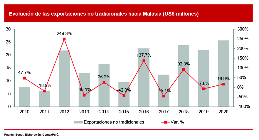 LAS IMPORTACIONES DE MALASIA PROVENIENTES DEL PERÚ CRECIERON A UNA TASA PROMEDIO ANUAL DEL 24.2% ENTRE 2010 Y 2020