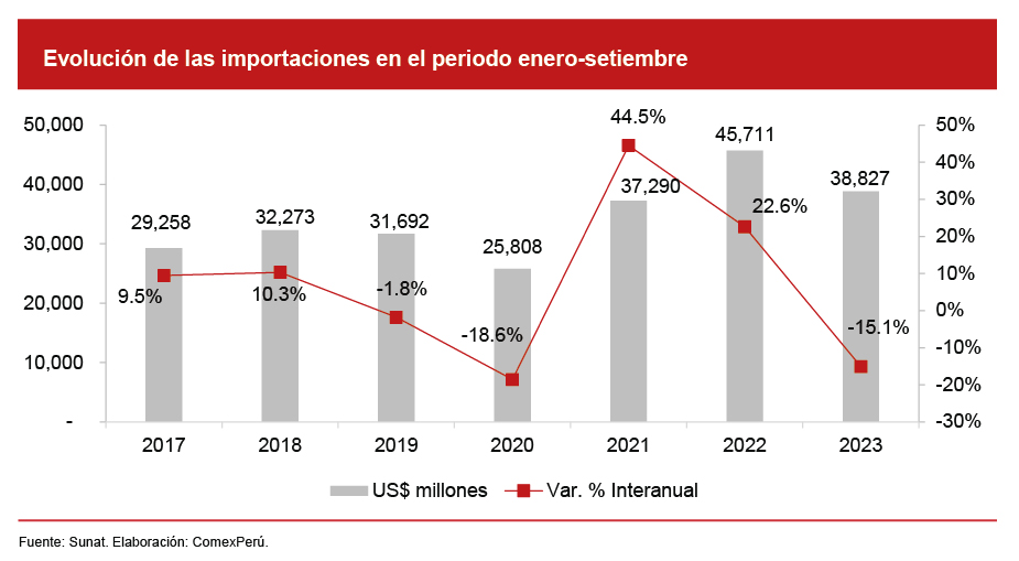 LAS IMPORTACIONES PERUANAS DESCENDIERON UN 15.1% A SETIEMBRE DE 2023