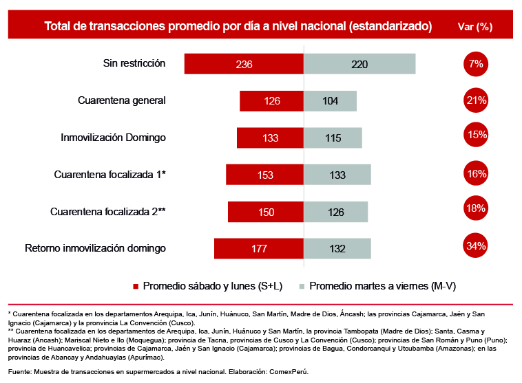Los resultados reflejan que las medidas de inmovilización social provocaron un incremento del número de transacciones promedio durante los fines de semana (incluye solo sábado y lunes), respecto de los demás días. Así, mientras que antes de la cuarentena la diferencia en el número de transacciones promedio era del 7%, y mayor los fines de semana, durante el periodo de aislamiento aumentó al 21% y, tras el retorno a la inmovilización dominical, se incrementó hasta el 34%. Las cifras presentadas reflejan que las compras de la población vienen incrementándose, pero, a su vez, se han trasladado a los fines de semana. Frente a esto, se esperaría que los comercios perciban mayor flujo de clientes y, con ello, se creen e incrementen los focos de contagio que se pretende evitar.