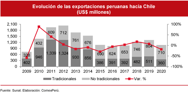 Los envíos tradicionales a Chile reportaron un valor de US$ 360 millones en 2020, el resultado más bajo registrado en los últimos 10 años. Además, durante el período 2009-2020, las exportaciones tradicionales han disminuido anualmente, en promedio, un 1%. En 2020, los sectores tradicionales con peor evolución en sus exportaciones fueron el de petróleo y derivados (US$ 85 millones, -58%) y el pesquero (US$ 40 millones, -25.8%).
