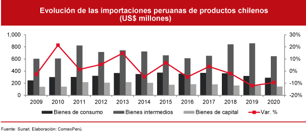 En cuanto a las importaciones, estas registraron un crecimiento anual promedio del 0.8% durante el período 2009-2020. En 2020, sumaron un valor de US$ 1,081 millones, un 19.3% menos que lo registrado en 2019. Esta última cifra refleja la menor recepción del país en bienes chilenos intermedios (US$ 646 millones, -24.6%), de capital (US$ 146 millones, -10.3%) y de consumo (US$ 289 millones, -9.4%).