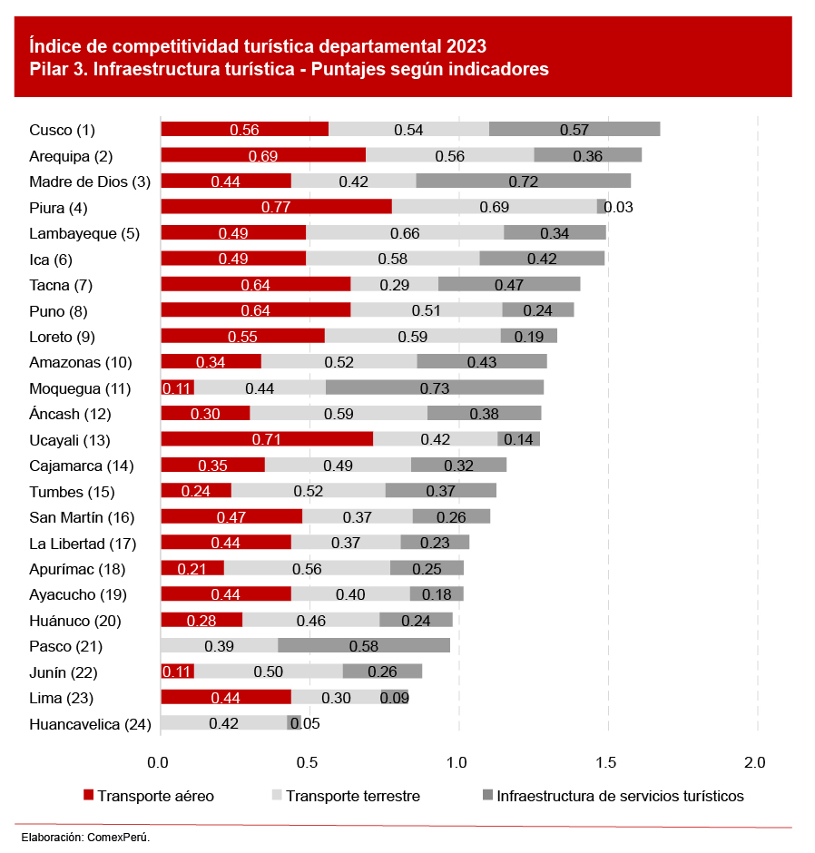 En 2023, el Cusco lideró el pilar de infraestructura turística, seguido por Arequipa y Madre de Dios. El mejor resultado relativo de Cusco respecto del resto de departamentos se debió, entre otros factores, a la oferta hotelera por cada 100,000 habitantes (155 hoteles), lo cual lo ubica en tercer lugar, solo después de Madre de Dios (183) y Pasco (158). Si bien el Aeropuerto Internacional Alejandro Velasco Astete no contó con el estudio de calidad del nivel de servicio ofrecido al usuario, según estándares de calidad internacionales, elaborado por la International Air Transport Association (IATA), sí tuvo el 100% de requerimientos de calidad o de servicios e infraestructura en el aeropuerto. Resalta el Aeropuerto Internacional Padre Aldamiz, de Puerto Maldonado, que cumplió con el 100% de los indicadores IATA en 2023, lo que demuestra una mejora frente al 40% alcanzado por Madre de Dios en 2022.