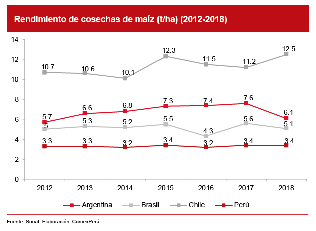 Además, debido a la mejora en su calidad, la producción a través de OVM se caracteriza por un mayor rendimiento frente a los cultivos tradicionales. Esto se puede apreciar, por ejemplo, en el desempeño de los cultivos de maíz en países como Argentina, Brasil y Chile, en los cuales se han implementado cultivos genéticamente modificados que superan ampliamente al nuestro. En particular, según información de la Organización de las Naciones Unidas para la Alimentación y Agricultura (FAO, por sus siglas en inglés), el Perú presenta un bajo retorno en los cultivos de maíz, con apenas 3.4 toneladas por hectárea cosechada (t/ha) en 2018, cifra mucho menor a lo registrado en Chile, con 12.5 t/ha, Argentina (6.1) y Brasil (5.1 t/ha).