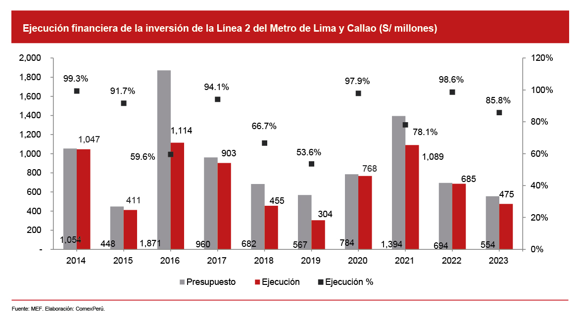 Ahora bien, de acuerdo con información del Ministerio de Economía y Finanzas (MEF), el monto total de inversión actualizado de la Línea 2 del Metro de Lima asciende a S/ 17,215 millones, de los cuales apenas se han ejecutado S/ 7,251 millones (42.1% del total) hasta el 17 de agosto de 2023, a pesar de que la construcción empezó en abril de 2014. Como consecuencia, actualmente, el gobierno estima que el proyecto termine por completo en diciembre de 2030, a pesar de que inicialmente estaba programado para junio de 2019.