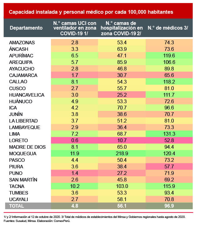 Las cifras presentadas muestran el esfuerzo realizado para atender la emergencia sanitaria a lo largo de estos meses. Evidentemente, ahora tenemos una mayor capacidad de respuesta en comparación con nuestra situación a principios de año, y hace unas semanas, desde el Ejecutivo, se comentó que el Perú está preparado ante un posible rebrote. Sin embargo, cabe preguntarse qué criterios garantizan nuestra preparación ante semejante evento. Para resolver esta interrogante, y a partir de la información proporcionada por Susalud y los datos del Minsa, se calculó el número de camas UCI con ventilador, el de camas de hospitalización en zona COVID-19 y el de médicos por cada 100,000 habitantes [2], en los distintos departamentos.