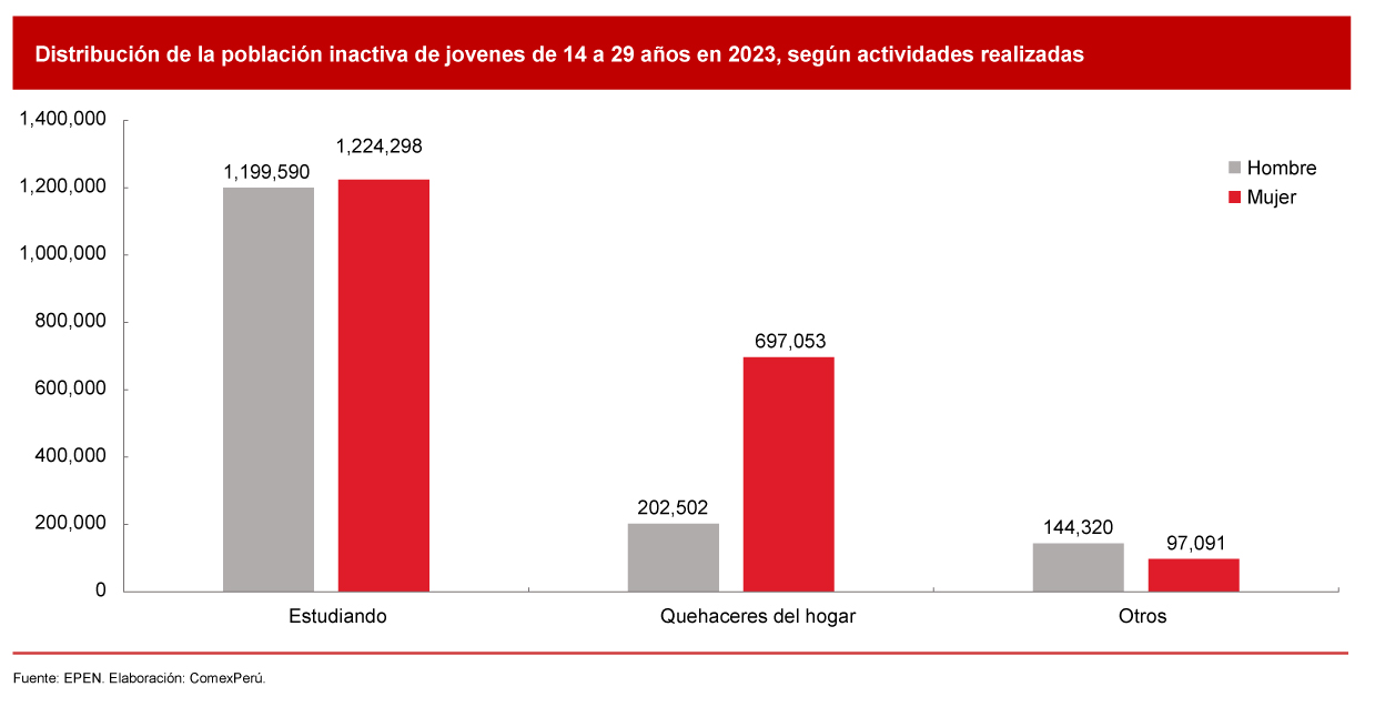 El exceso de labores domésticas limita la inserción laboral para las jóvenes, porque 279,224 de ellas querían trabajar, pero no buscaron empleo y se limitaron a realizar quehaceres del hogar. La población masculina en esta situación apenas fue de 64,886. Esta situación desincentiva a las mujeres a continuar capacitándose o culminar sus estudios.