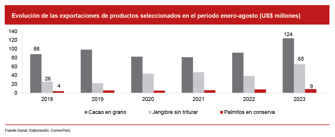 La diversidad de productos y su cultivo en las diferentes zonas geográficas de nuestro país generan más protagonistas en la oferta exportable agrícola. Si bien, en lo que va del año, el sector agroexportador evidencia un menor dinamismo, debido al efecto de los fenómenos climáticos, existen productos que, de acuerdo con cifras de la Sunat, presentaron un desempeño positivo en sus exportaciones entre enero-agosto de 2023. Por ello, en esta edición, destacamos a tres de ellos: el cacao en grano, el jengibre sin triturar ni pulverizar, y los palmitos en conserva.