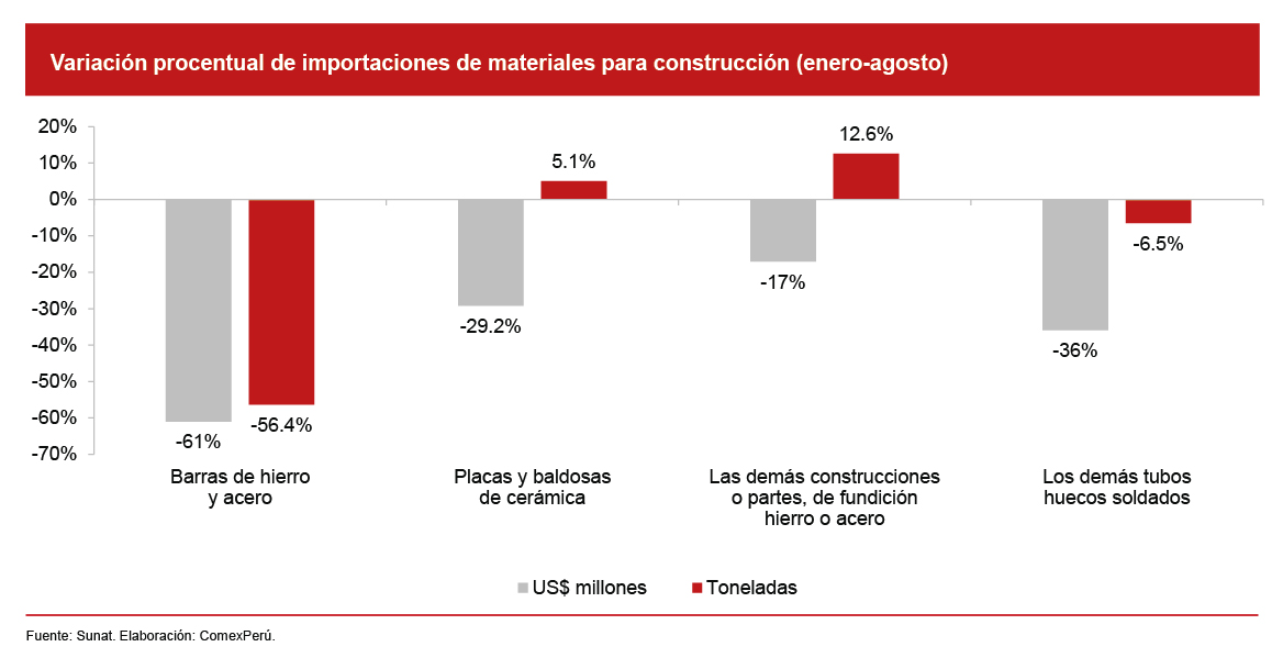Además, es importante destacar que el bajo rendimiento en el sector de construcción ha tenido un impacto en la importación de materiales de construcción. Según cifras de la Sunat, hasta agosto de este año, las importaciones de materiales de construcción sumaron US$ 848 millones, lo que refleja una reducción del 31.8% con respecto al mismo periodo de 2022. De esta manera, si analizamos el producto más importado en este periodo, encontramos que fueron las barras de hierro y acero, cuyo monto y volumen importados mostraron variaciones del -61% y el -56.4%, respectivamente. Una situación similar ocurre con los demás tubos soldados (-36% en monto; -6.5% en volumen). Mientras que los productos que presentaron un menor monto importado pero un mayor volumen fueron las placas y baldosas (-29.2% en monto; +5.1% en volumen) y las demás construcciones de fundición de hierro o acero (-17% en monto; +12.6 en volumen).