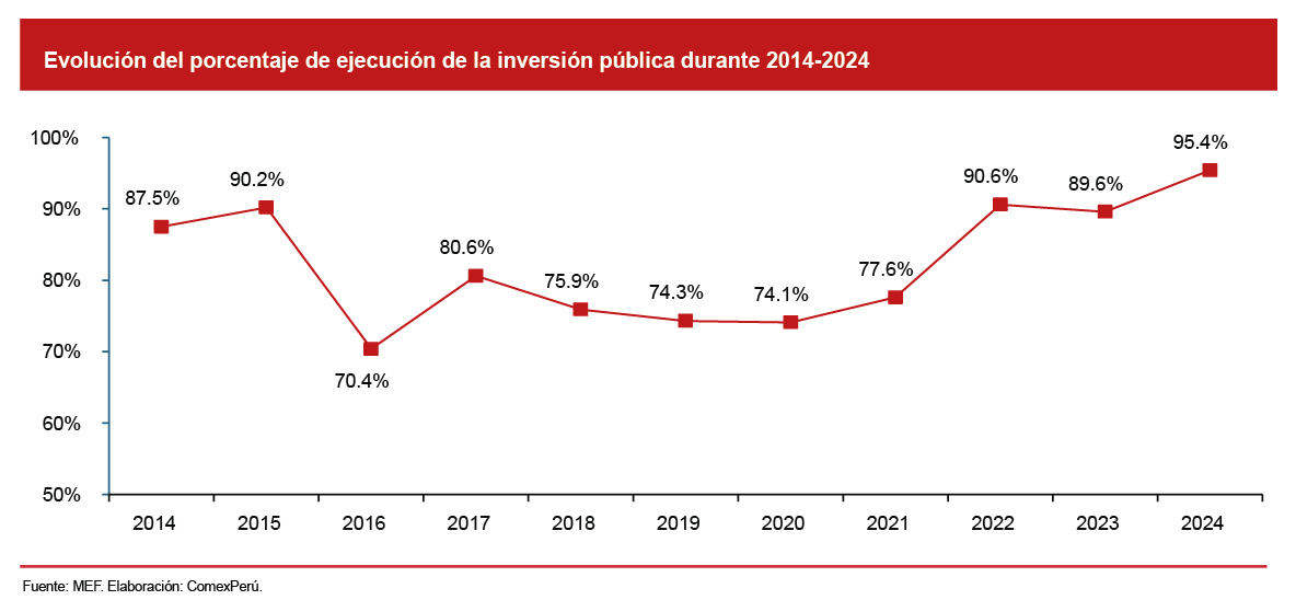 El próximo año estará marcado por un proceso electoral general. Y, la evidencia histórica muestra que los ciclos electorales suelen venir acompañados de una menor ejecución de la inversión pública en la etapa previa. En 2016, por ejemplo, la ejecución cayó al 70.4%, uno de los niveles más bajos de la última década, mientras que, en 2021, aunque se registró un avance levemente mayor que el del año previo, el resultado fue ampliamente superado en 2022. Estos patrones reflejan que, en la fase preelectoral, se suele reducir el ritmo de ejecución debido a mayores exigencias de control, rotación de equipos técnicos y cautela administrativa.