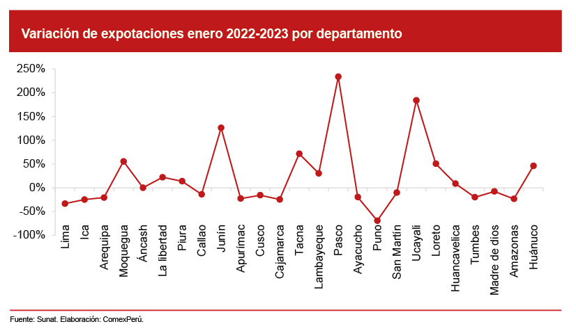 Por otro lado, si bien las exportaciones no tradicionales crecieron un 7.3% con relación a enero de 2022, esto no implica que todos los departamentos hayan tenido resultados positivos.