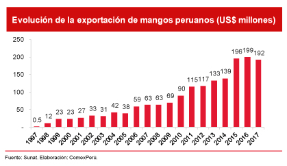 De acuerdo con cifras de la Sunat, en 2017, las exportaciones peruanas de mangos alcanzaron un récord histórico. Con 162,680 toneladas y un valor de US$ 191.8 millones en envíos al mundo, se posicionaron como el sexto producto más importante de nuestra canasta agroexportadora y el noveno en cuanto al rubro no tradicional. Si bien este resultado representó una caída en términos de valor monetario, de un 3.8% con respecto a 2016, en volumen enviado hubo un incremento del 1.1%. Este resultado mixto se debió principalmente a los menores envíos (y a los menores precios asociados) hacia EE.UU. y Reino Unido, dos de los principales destinos de nuestros mangos; lo que fue contrarrestado por el mejor desempeño en Países Bajos y los mayores precios promedio en Francia, Alemania, Suiza y Corea del Sur.