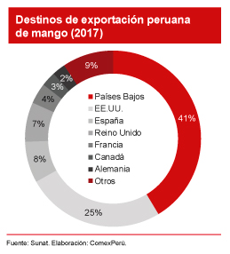 Actualmente, los cinco principales destinos de exportación del mango peruano representan, en conjunto, el 86% de nuestros envíos totales. Países Bajos se posiciona como el destino por excelencia, al alcanzar, en 2017, los US$ 79.4 millones, con un crecimiento del 3.8% respecto de 2016. Le siguieron EE.UU., con US$ 48.9 millones (-11.9%); España, con US$ 14.5 millones (+11.4%); Reino Unido, con US$ 13.9 millones (-23%), y Francia, con US$ 7.3 millones (-13.6%). De igual manera, hoy son 234 empresas las que exportan mangos peruanos, entre las que se encuentran Sunshine Export, Camposol, Dominus, Asica Farms y Agroindustrias Golden Fresh, como las principales.