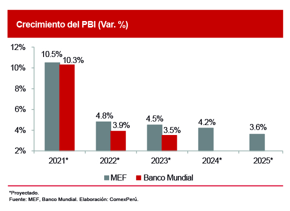 En primer lugar, las estimaciones del PBI suponen un crecimiento superior al 4% para el período 2021-2024. Según el Ministerio de Economía y Finanzas (MEF), las razones que sustentarían este incremento serían la mejora gradual de la confianza de los agentes económicos, lo que incrementaría el gasto privado, las mayores exportaciones por la puesta en marcha de Quellaveco y la mejora de la demanda externa.