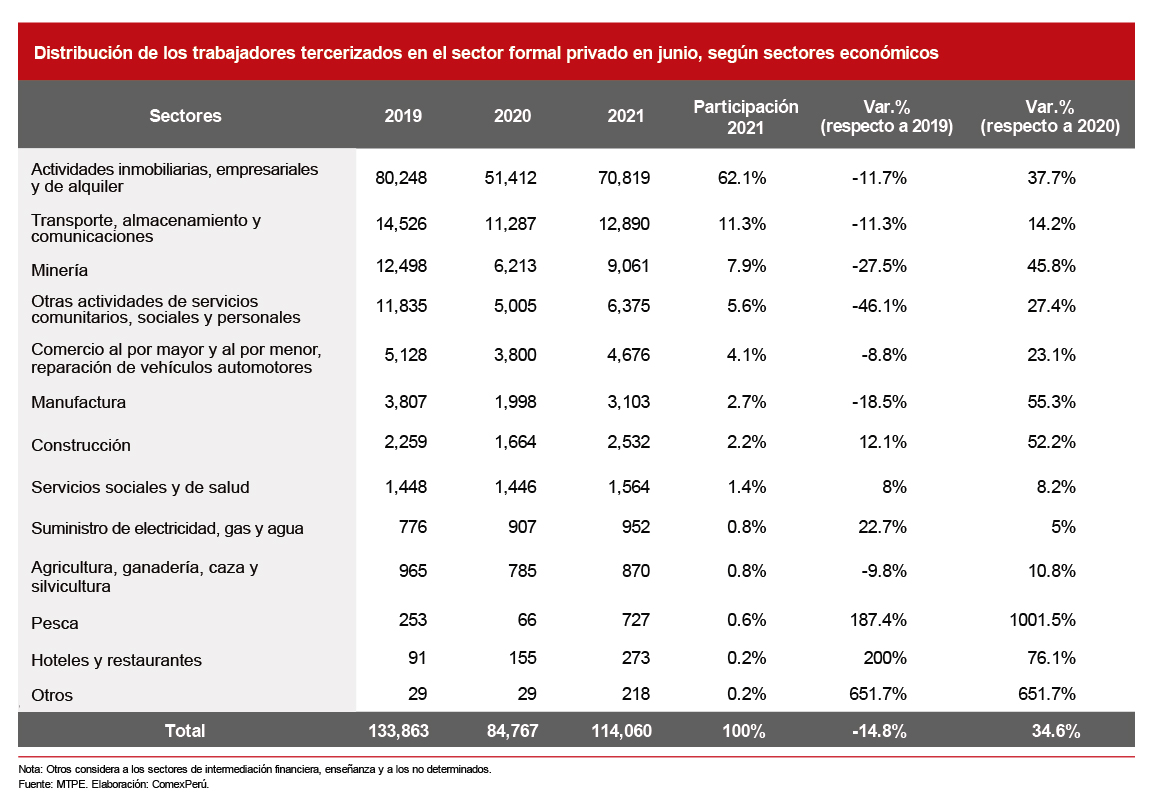 De acuerdo con el último boletín estadístico del MTPE, a junio del año pasado, la cantidad de trabajadores tercerizados en el sector privado ascendió a 114,060 empleados a nivel nacional, lo cual representó un 3.3% del total de puestos de trabajos formales privados durante el mismo mes. Esta cifra significó, a su vez, un incremento del 34.6% con relación al mismo mes de 2020, pero una contracción del 14.8% respecto de los 133,863 empleos tercerizados en junio de 2019.
