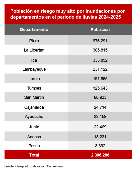 Existen más de 13.5 millones de personas vulnerables a inundaciones en el territorio nacional, según el Centro Nacional de Estimación, Prevención y Reducción del Riesgo de Desastres (Cenepred). De estas, 2.4 millones se encontrarían en muy alto riesgo, siendo Piura el departamento más vulnerable, con 975,291 personas en dicho estado, le siguen La Libertad (385,815 personas en riesgo alto), Ica (333,852 personas) y Lambayeque (231,122 personas).