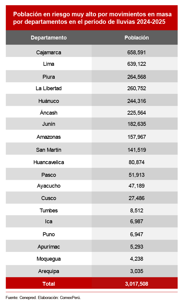 Asimismo, más de 12 millones de personas estarían en riesgo por movimientos en masa, según el Cenepred, de los cuales más de 3 millones se encuentran en un nivel de riesgo muy alto. El departamento más vulnerable en este caso es Cajamarca, con 658,591 personas en áreas de alto riesgo. A este le siguen Lima (639,122 personas), Piura (264,568 personas) y La Libertad (260,752 personas).