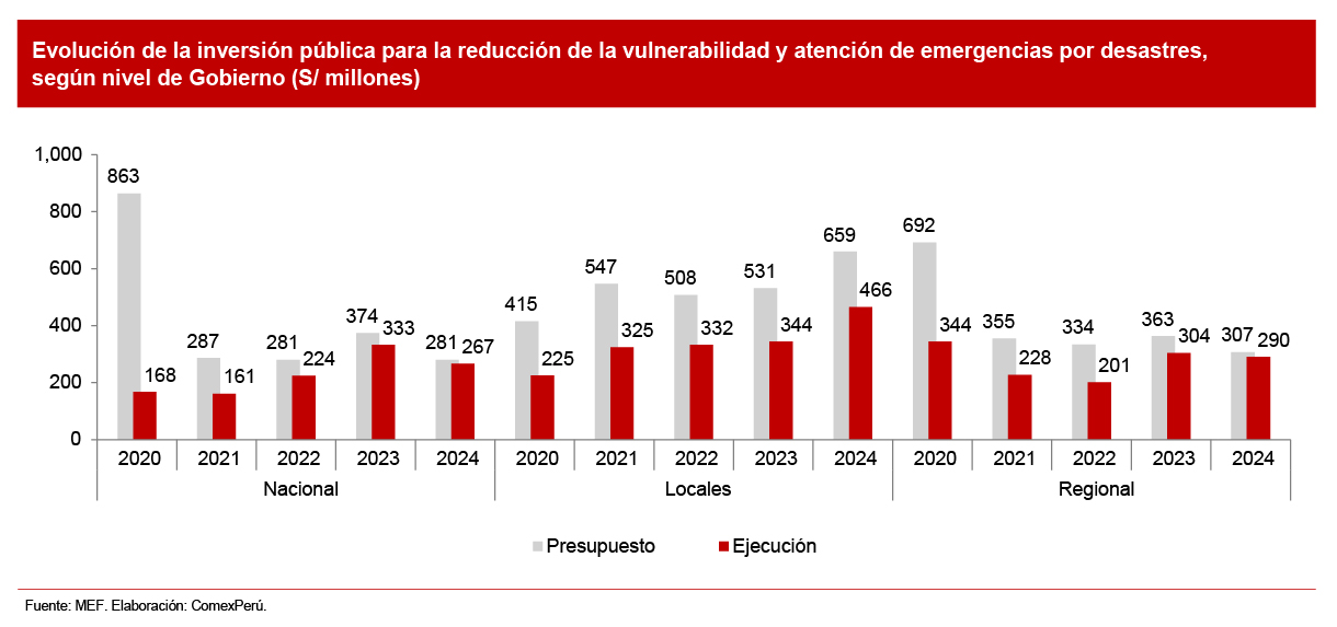 No obstante, la menor ejecución histórica de los Gobiernos locales limitaría la efectividad de esta política, según datos del MEF. En 2024, estos contaban con un presupuesto de S/ 659 millones para la reducción de vulnerabilidades, pero solo ejecutaron S/ 466 millones, lo cual significa que S/ 193 millones se dejaron de utilizar en la construcción de infraestructura para proteger a la población frente a desastres naturales. Entre los tres niveles de gobierno, el presupuesto sin utilizar en este rubro ascendió a S/ 2,586 millones.