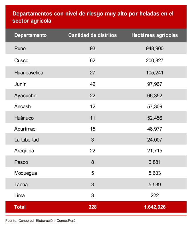 El informe técnico del Centro Nacional de Estimación, Prevención y Reducción del Riesgo de Desastres (Cenepred) destaca que 1,642,026 hectáreas (ha) de superficie agrícola de 328 distritos enfrentan niveles de riesgo muy alto debido a las heladas. Esto significa que esas zonas son más propensas a ser afectadas por este fenómeno climatológico, lo que hace que la actividad agrícola sea más vulnerable. Los departamentos con mayor superficie agrícola en esta situación son Puno (948,900 ha), Cusco (200,827 ha) y Huancavelica (105,241 ha).