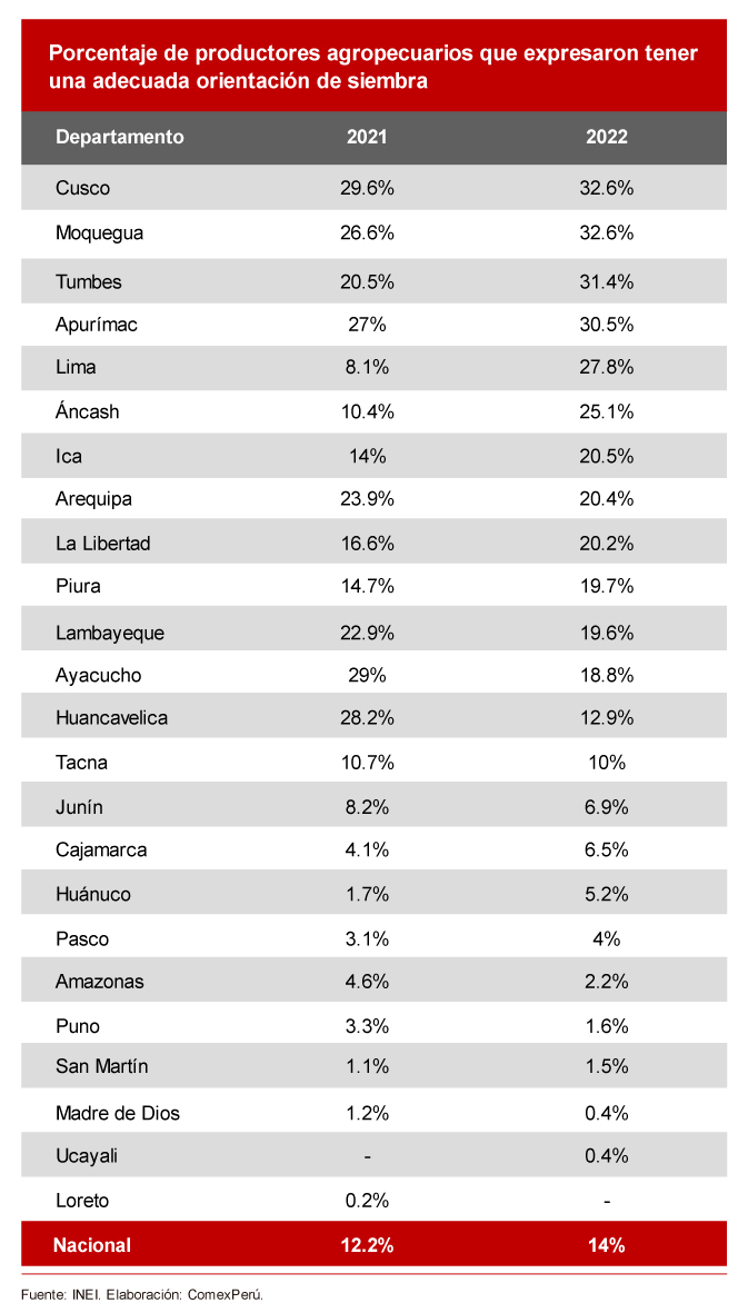En 2021 y 2022, menos del 50% de los productores agropecuarios encuestados de cada departamento considera que tienen una correcta orientación de siembra. En 2022, solo un 14% a nivel nacional declaró contar con la guía adecuada, según la Encuesta Nacional Agropecuaria. Los departamentos con el menor porcentaje de productores agropecuarios tienen una adecuada orientación de siembra en ese año fueron San Martín (1.5% del total), Madre de Dios (0.4%) y Ucayali (0.4%).