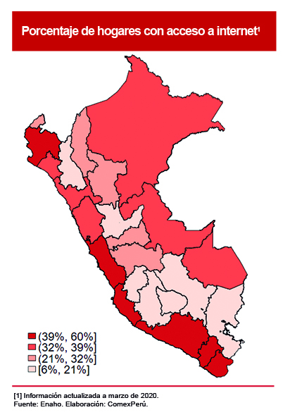 Pese a las promesas de la RDNFO, los resultados de interconexión no han sido los esperados. Aun con el gran despliegue de la red, el mejor acceso a internet continúa centrado en la zona costera del país. Según el Instituto Nacional de Estadística e Informática (INEI), el 62.9% de los hogares de Lima Metropolitana tuvo acceso al servicio de internet entre enero y marzo de 2020. Asimismo, a nivel departamental, según la Encuesta Nacional de Hogares (Enaho), durante el primer trimestre de 2020, el 59.7% de los hogares de Lima tuvo algún tipo de conexión a internet. De similar forma para Arequipa (57.1%) y Moquegua (53.2%). No obstante, la conexión en otros departamentos no alcanza ni el 15%, como ocurre en Cusco (14.8%), Cajamarca (6.9%) y Huancavelica (6%), pese a contar con 25, 24 y 19 nodos de la RDNFO, respectivamente.