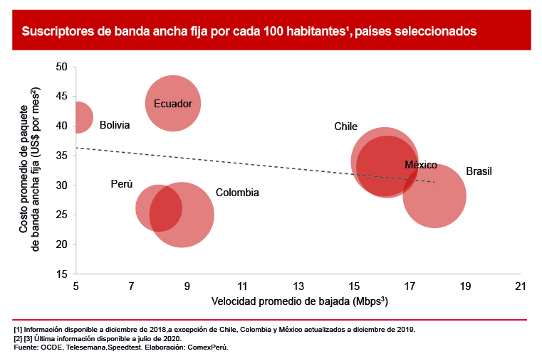 Los problemas internos se desbordan al nivel internacional. Basta decir que el Perú fue el país de la Alianza del Pacífico con menor velocidad de internet durante julio de 2020. Esto supone un problema si se considera la necesidad de migrar a plataformas digitales en materia de salud, educación, comercio, entre otros, en el escenario de la crisis sanitaria. Además, es importante mencionar que nuestro país se encuentra bastante rezagado en el número de usuarios de conexiones de banda ancha fija, de las cuales solo un 5% son de fibra óptica, según Apoyo Consultoría. Esta cifra es preocupante si se tiene en cuenta que en Chile, Colombia y México las conexiones fijas de este tipo representaron el 28%, 25% y 14% del total de conexiones de banda ancha durante 2019, respectivamente, según estadísticas de la Organización para la Cooperación y el Desarrollo Económicos (OCDE).