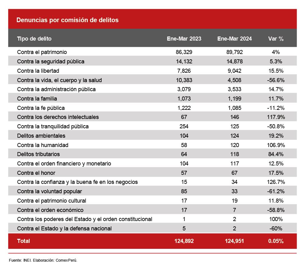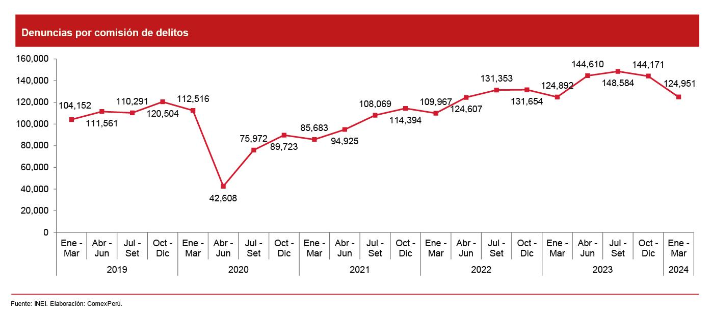 A nivel nacional, las denuncias por comisión de delitos registradas en el Sistema de Denuncias Policiales (SIDPOL) de la Policía Nacional del Perú muestran un incremento sostenido desde el segundo trimestre de 2020, según el informe técnico de Estadísticas de la Criminalidad, Seguridad Ciudadana y Violencia del INEI. Estas denuncias abarcan delitos cometidos contra el patrimonio; contra la vida, el cuerpo y la salud; contra la seguridad pública; contra la libertad, entre otros. Entre enero y marzo de 2024, hubo 124,951 denuncias registradas, lo que significó un incremento de 59 denuncias en comparación con el mismo periodo de 2023 y de 14,984 denuncias respecto del mismo periodo de 2022.