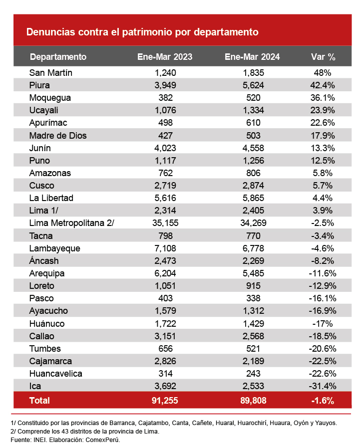 La mitad de los departamentos ha registrado un aumento en delitos contra el patrimonio, como hurto, fraude, extorsión, estafa, entre otros. Los departamentos con un mayor incremento en el número de casos registrados por la Policía Nacional son San Martín, Piura y Moquegua.