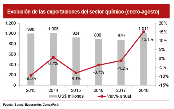 En cuanto al sector químico, los envíos pasaron de US$ 879 millones, en el periodo enero-agosto de 2017, a US$ 1,022 millones en el mismo periodo de 2018 (+15.1%), lo que ubica a este sector como el cuarto de mayor dinamismo entre los del rubro no tradicional, y el tercero en participación en el ranking del mismo, detrás de los sectores agropecuario y pesquero.