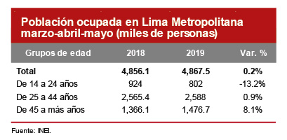Si observamos las cifras del INEI sobre empleo, para el periodo marzo-mayo de este año, se estima que en Lima Metropolitana existen 7.8 millones de personas con edad para desempeñar una actividad económica, la llamada población en edad de trabajar (PET). La PET está compuesta por la población económicamente activa (PEA), que alcanza el 67% de esta (5.2 millones) y la población económicamente no activa (No PEA), que representa el 33% restante (2.6 millones). Si analizamos con mayor profundidad a la PEA, veremos que, al realizar la comparación con el mismo período del año anterior, la población ocupada pasó de 4,856,100 a 4,867,500 personas, es decir, se incrementó en apenas un 0.2%, mientras que la tasa de desempleo de Lima Metropolitana se ubicó en un 6.7% de la PEA. En cuanto al comportamiento de la población ocupada según la edad, las cifras indican que el grupo de 45 a más años aumentó en 8.1% y el grupo de 25 a 44 años, en 0.9%. Sin embargo, en el caso de los jóvenes ocupados de 14 a 24 años (grupo que conforma un 16.5% del total de la PEA ocupada), disminuyó un 13.2%, lo que despierta la preocupación sobre la necesidad de potenciar la empleabilidad de nuestros jóvenes.