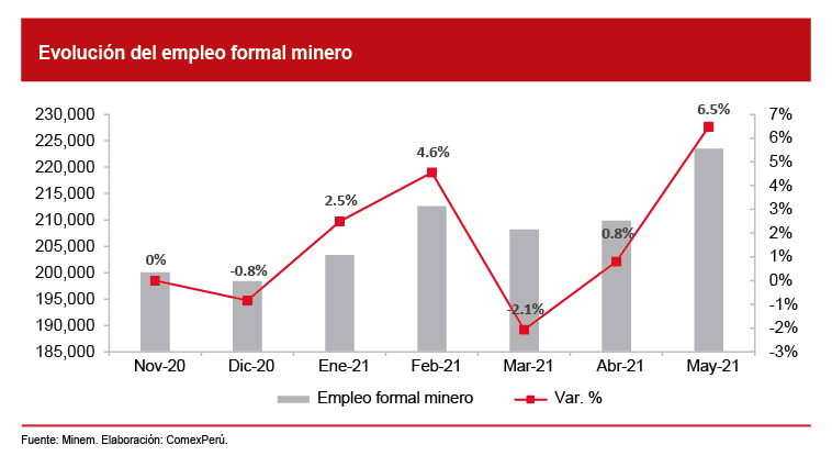 En primer lugar, tenemos el aporte de la minería a la generación de empleo. Según el boletín del Ministerio de Energía y Minas (Minem) de mayo, el empleo directo del subsector minero fue igual a 223,458 trabajadores, lo que significó un aumento del 6.5% con respecto a abril. De la misma manera, en lo que va del presente año, este sector creó más de 24,000 empleos formales directos con respecto a diciembre 2020. Las cinco regiones que lideran la distribución del empleo formal minero son Áncash, Arequipa, Moquegua, Junín y La Libertad.