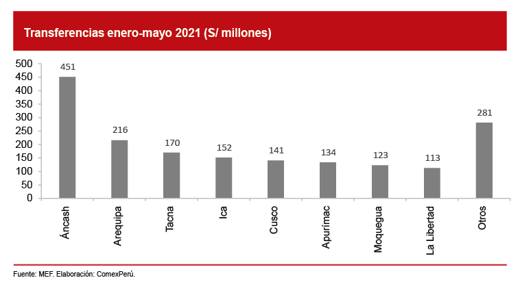 En tercer lugar, el sector genera una gran cantidad de recursos para el Estado. Si se toman en cuenta los cinco primeros meses del 2021, las transferencias mineras a las regiones por conceptos de canon minero, regalías mineras legales y contractuales, y derecho de vigencia sumaron un total de S/ 1,781 millones. Estas se destinaron a los Gobiernos subnacionales y universidades nacionales para inversión en infraestructura e investigación. Las regiones que más se beneficiaron con estas transferencias fueron Áncash, con más de S/ 451 millones; Arequipa, con más de S/ 216 millones; y Tacna, con aproximadamente S/ 170 millones.