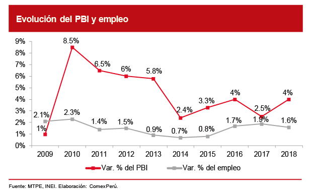 Si bien dicho comportamiento no implica la carencia de alternativas de solución, sí evidencia una enfermedad previa en nuestro mercado laboral, pues el bajo crecimiento del empleo, pese a no presentar mayores complicaciones macroeconómicas como la actual, refleja su bajo nivel de respuesta frente al crecimiento de la producción nacional. Así, como se puede apreciar a continuación, el incremento del empleo se ha mantenido en la mayoría de los casos por debajo de la mitad del crecimiento del PBI.