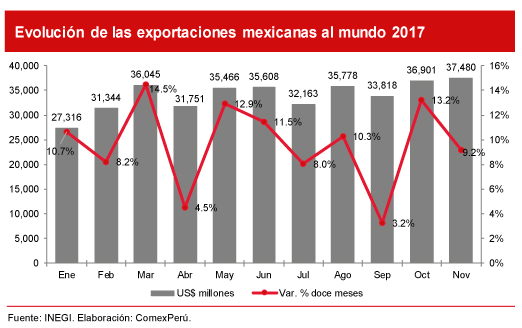 De acuerdo con el Fondo Monetario Internacional (FMI), en la segunda mitad de 2017, la actividad económica de México habría registrado un crecimiento ligeramente superior al 2.1%, impulsada por una mayor demanda externa. Esto, debido a un crecimiento de sus exportaciones en los meses de agosto, setiembre, octubre y noviembre, del 10.3%, 3.2%, 13.2% y 9.2%, respectivamente, así como por la recuperación del precio del petróleo a US$ 66.42 el barril en el mes de diciembre y a la estabilización de la economía estadounidense. Dicho escenario contrarrestó la caída del 0.6% del consumo privado en el mercado interno en el mes de octubre, y el resultado de la inversión pública y privada para el tercer trimestre de 2017 (-4.9% y +0.1%, respectivamente). Cabe mencionar que, según el Banco Mundial, en 2018, la economía mexicana mantendría el mismo dinamismo reflejado durante 2017, debido a un grupo de factores que generarían incertidumbre política y económica en el país: i) la renegociación del Tratado de Libre Comercio de América del Norte (TLCAN), ii) el ajuste fiscal de EE.UU. y iii) el resultado de las elecciones presidenciales.