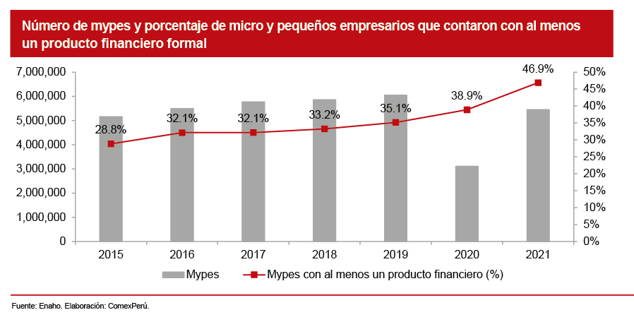 Según datos de la Enaho, el porcentaje de micro y pequeños empresarios que contó con al menos un producto financiero formal a nivel nacional en 2021 ascendió al 46.9%, 8 puntos porcentuales (pp.) más respecto de lo registrado el año anterior. Además, al analizar la evolución de las mypes con algún producto financiero a través de los años, se observa una tendencia creciente, acentuada en 2021, lo cual se sustenta, en gran medida, en el impacto que tuvo la pandemia de la COVID-19 en la necesidad de utilizar medios de pago digitales.