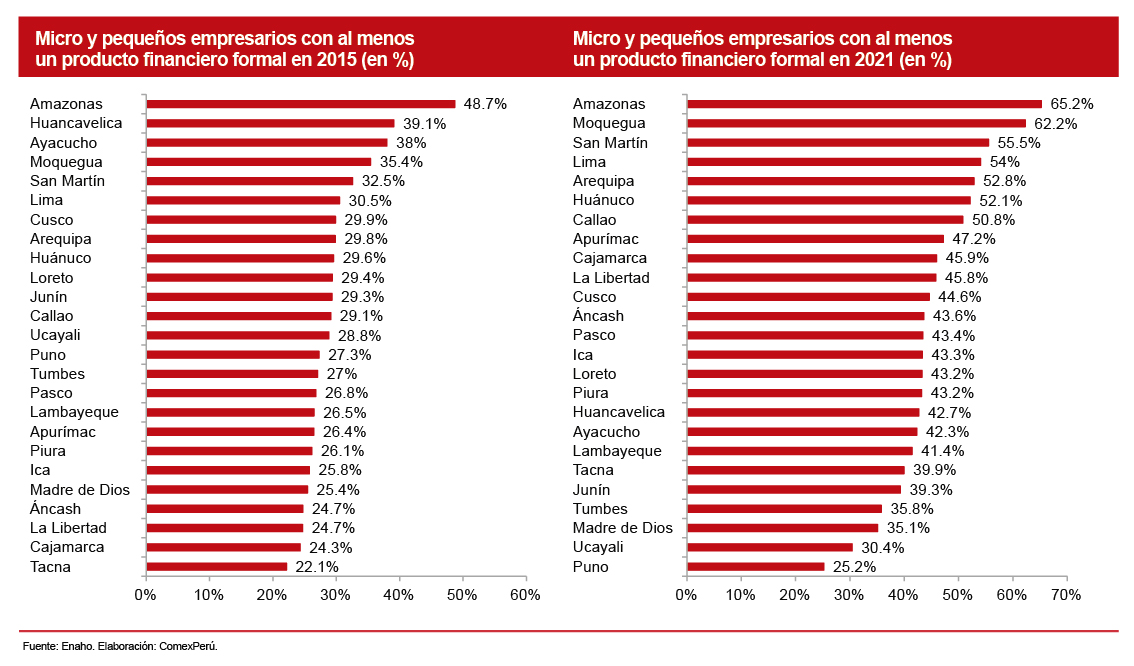 Por otro lado, el departamento que más avanzó en el porcentaje de microempresarios con al menos un producto financiero formal fue Moquegua, que pasó de registrar un 35.4% en 2015 a un 65.2% en 2021. En segundo lugar se ubica Lima, que pasó de un 30.5% en 2015 a un 54% en 2021. En contraste con esta mejora, los departamentos con menor avance en inclusión financiera fueron Puno, que pasó de registrar un 27.3% de microempresarios con uno o más productos financieros formales en 2015 a un 25.2% en 2021. Una situación similar se registró un Ucayali, que pasó del 28.8% en 2015 al 30.4% en 2021.