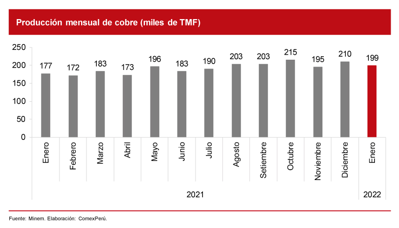 De acuerdo con el último boletín minero del Ministerio de Energía y Minas (Minem), la minería metálica tuvo resultados variados en enero de 2022, con incrementos en la producción de cobre a 199,255 toneladas métricas de contenido fino (TMF), lo que significó un incremento del 11.4% respecto al mismo mes de 2021; oro (7.9 millones de g finos; + 4.5%) y estaño (2,410 TMF; + 14.7%); y disminuciones en la producción de zinc (106,480 TMF; - 13.2%), hierro (795,348 TMF; - 29.6%) y plomo (20,568 TMF; - 1.8%).