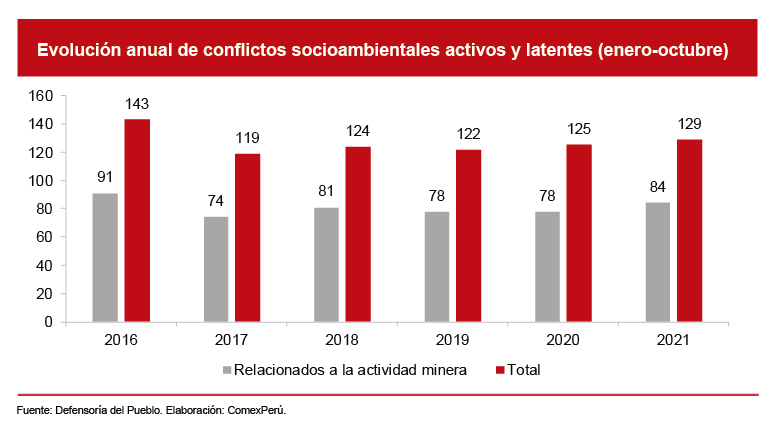 De acuerdo con cifras de la Defensoría del Pueblo, surgieron ocho nuevos conflictos sociales en el mes de octubre de 2021, con lo que suman un total de 129 conflictos socioambientales activos y latentes registrados a la fecha. Cabe resaltar que el 65.1% de estos conflictos (84 casos) están relacionados con la actividad minera.