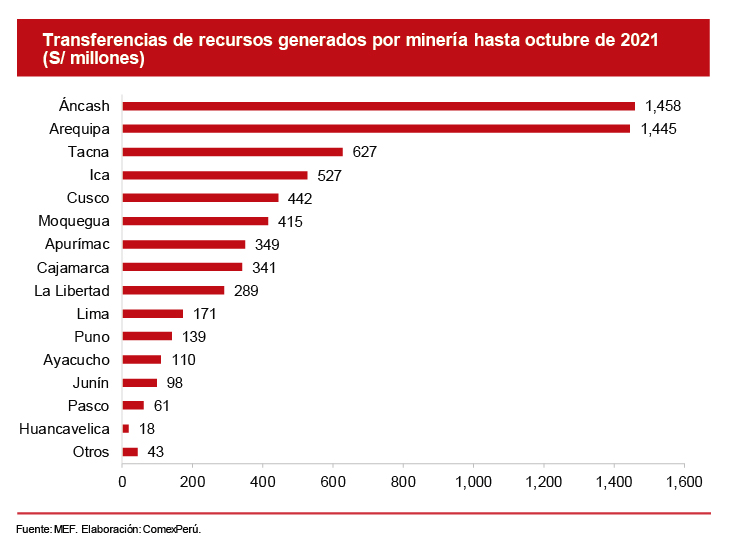 Según cifras del Ministerio de Economía y Finanzas (MEF), de enero a octubre de 2021 la transferencia de recursos por la minería asciende a S/ 6,535 millones, de los cuales S/ 2,947 millones pertenecen a canon minero; S/ 3,298 millones, a regalías mineras, y S/ 290 millones, a derecho de vigencia y penalidad. Entre los departamentos que reciben mayores recursos por parte de la minería se destacan Áncash (S/ 1,458 millones), Arequipa (S/ 1,445 millones), Tacna (S/ 627 millones), Ica (S/ 527 millones) y Cusco (S/442 millones).