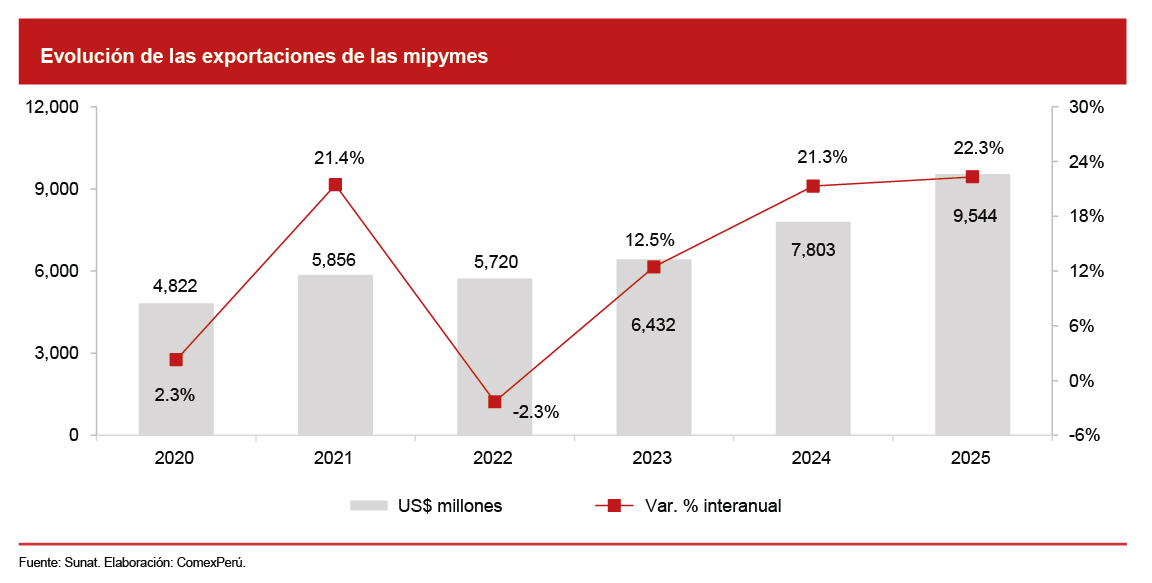 De acuerdo con las cifras de Sunat, las mipymes exportadoras reflejaron un crecimiento tanto en valor exportado como en el número de empresas durante 2025. En términos de valor, estas exportaron US$ 9,544 millones, lo que representó un crecimiento del 22.3% respecto de 2024. En cuanto al número de empresas, las mipymes aumentaron un 1.9%, al pasar de 8,640 en 2024 a 8,801 en 2025.