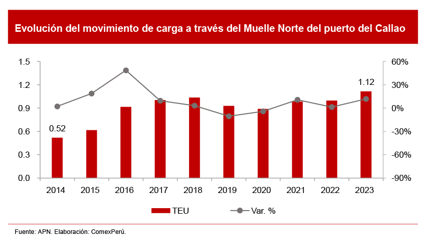 Estos proyectos buscan garantizar la capacidad necesaria para atender el crecimiento constante del terminal, que en la última década (2014-2023) ha mostrado un incremento sostenido. Durante este periodo, el volumen total de carga movilizada creció de 15.5 millones de TM en 2014 a 18.1 millones de TM en 2023, con un aumento promedio anual del 1.7%. En carga contenerizada, el desempeño fue aún más dinámico, con un salto de 518,729 TEU en 2014 a 1.1 millones en 2023, lo que reflejó un crecimiento promedio anual del 8.9%. Al cierre de noviembre de 2024, el Muelle Norte movilizó más de 1 millón de TEU, un crecimiento interanual del 0.1%, de acuerdo con datos de la APN.