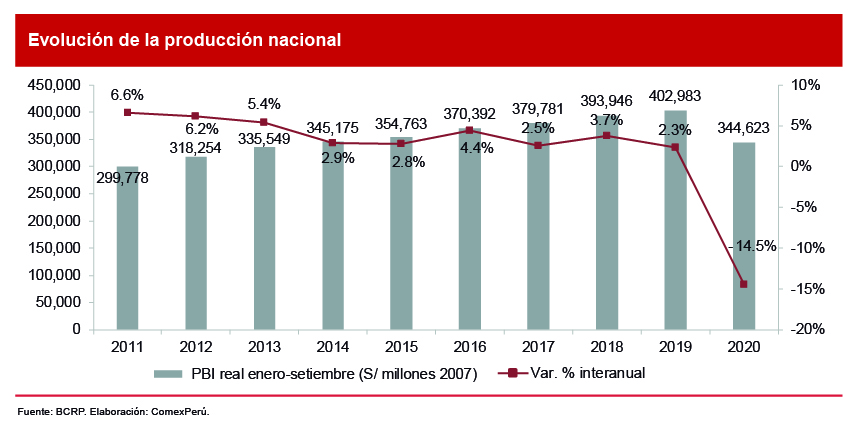 De acuerdo con el INEI, tan solo en el mes de setiembre, el PBI se contrajo un 7% frente a dicho mes en 2019. Este es el resultado menos negativo de los últimos siete meses, lo que evidencia la tímida recuperación de la economía nacional y su actividad productiva. Sin embargo, los sectores alojamiento y restaurantes (-50.1%); transporte, almacenamiento, correo y mensajería (-25.7%); servicios prestados a empresas (-16.6%); minería e hidrocarburos (-12.2%); otros servicios (-9.6%); manufactura (-6.3%); comercio (-6.1%); agropecuario (-2.6%) y electricidad, gas y agua (-1.7%) fueron los más perjudicados.